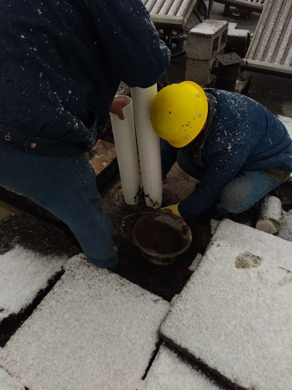 樓頂作業(yè)人員根據(jù)施工需要,或蹲著、或彎著腰、或趴在冰涼的地板上,有的在地面搬運材料,有的在樓道里安裝環(huán)管,有的在樓頂進行套管密封,并采取倒班作業(yè)的方式進行。