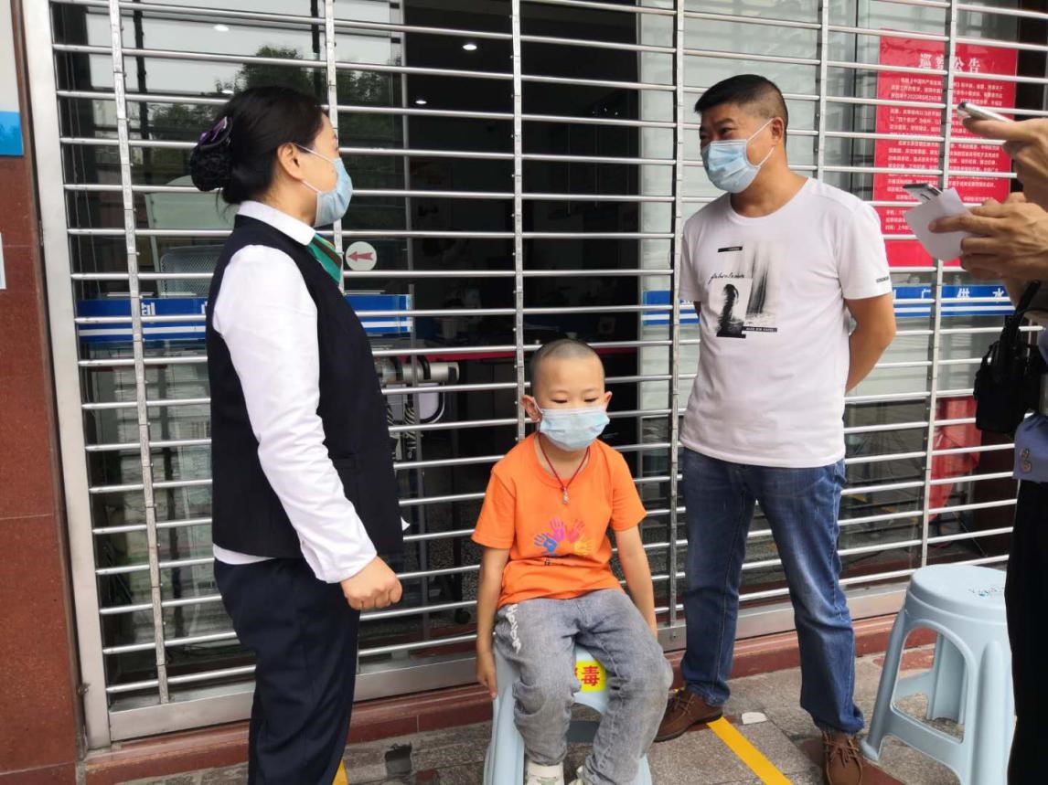 當(dāng)日中午,龍泉營業(yè)廳大堂經(jīng)理王萍發(fā)現(xiàn)一名年幼的小男孩獨自坐在營業(yè)廳門前的馬路邊哇哇大哭,臉上一臉驚恐。極具責(zé)任心和愛心的王萍急忙上前詢問發(fā)生了什么事?從孩子口中得知,他是大悟人,上午和媽媽、妹妹到西寶山游玩時走散了,又不知道回家的路,他很著急,不知道該怎么辦。