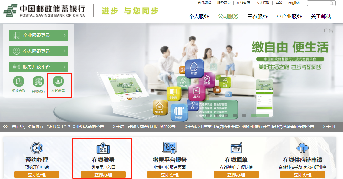 登錄繳費(fèi)用戶登錄“中國郵政儲(chǔ)蓄銀行”官網(wǎng)(http://www.psbc.com/cn/),點(diǎn)擊“服務(wù)快捷通道-在線繳費(fèi)”進(jìn)入,無需注冊(cè)及登錄。