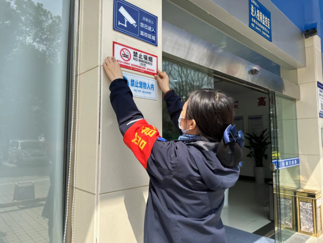 (圖為窗口工作人員張貼禁煙提示牌)