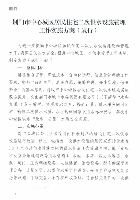 關(guān)于印發(fā)《荊廣市中心城區(qū)居民住宅二次 供水 設(shè)施管理工作實(shí)施方案(試行)》的通知