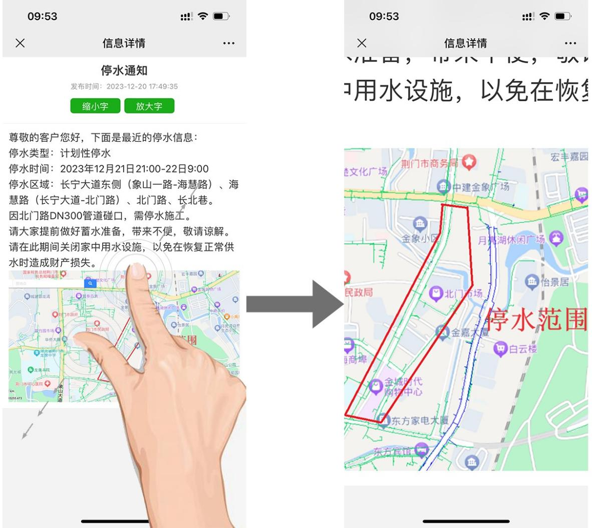 最新停水通知發(fā)出后,用戶(hù)通過(guò)【查看詳情】,點(diǎn)擊綠色【放大字】按鈕,可清晰查看停水類(lèi)型、停水時(shí)間和停水區(qū)域。