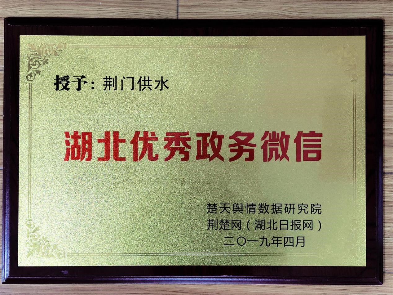 4月26日上午,由省委網信辦指導、湖北日報傳媒集團主辦的2019湖北第二屆政能量峰會在武漢舉行。會上,“荊門供水”微信公眾號被楚天輿情數(shù)據(jù)研究院、荊楚網(湖北日報網)表彰為“全省優(yōu)秀政務微信公眾號”。