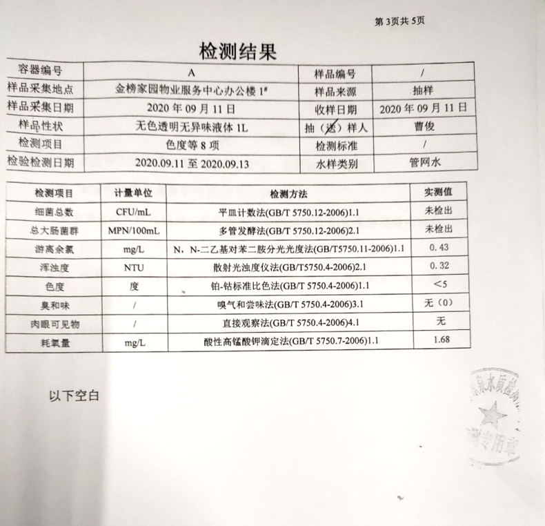本著“用戶至上”的服務(wù)宗旨,為徹底消除用戶對荊城自來水水質(zhì)問題的疑慮,檢測人員再次進行現(xiàn)場抽樣,并將水樣送至有相關(guān)檢驗檢測資質(zhì)的第三方檢測機構(gòu)—荊門市詠泉水質(zhì)檢測有限公司進行檢測。檢測結(jié)果顯示該用戶家中自來水各項指標(biāo)均符合《生活飲用水衛(wèi)生標(biāo)準(zhǔn)》(GB5749-2006)。具體檢測項目及結(jié)果見下圖:
