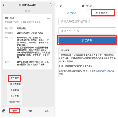 1.進(jìn)入“荊門市供水總公司”微信公眾號(hào),點(diǎn)擊“用水”,選擇“賬號(hào)綁定”,點(diǎn)擊“綁定新水表”,輸入10位數(shù)字用戶編號(hào)、用戶名稱綁定戶號(hào)。